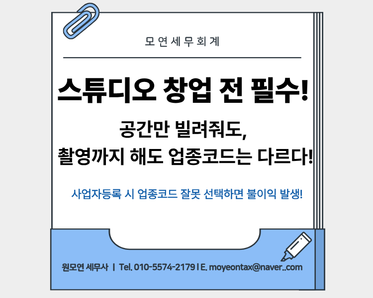 스튜디오를 창업할 때 가장 먼저 고민되는 부분 중 하나가 바로 사업자등록 시 업종코드 선택입니다.